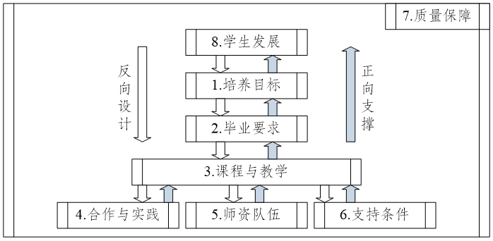 第四条 质量持续改进主要包括培养目标、毕业要求、课程与教学、合作与实践、师资队伍、支持条件、质量保障和学生发展等要素,其支撑关系如图1所示。
